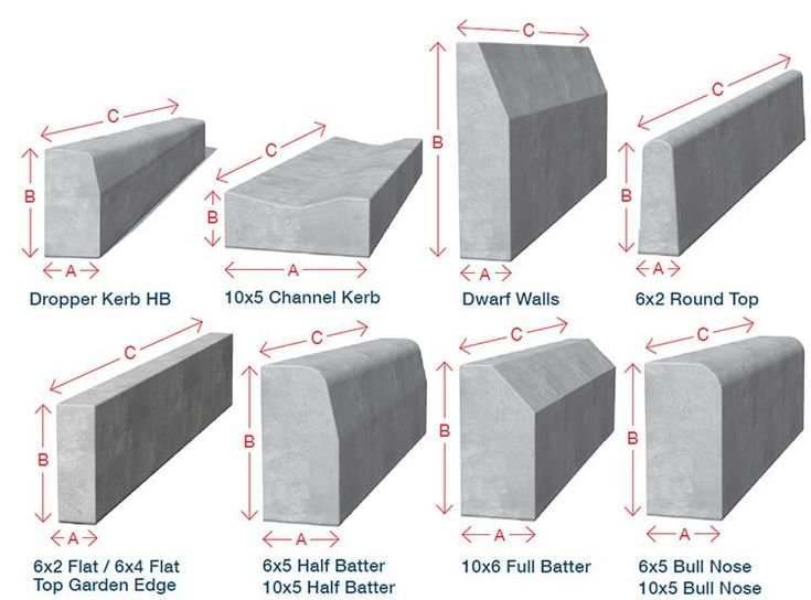 - Concrete kerbs: versatile and durable, including options like standard kerbs (for curves) and decorative options.